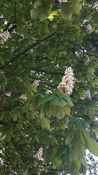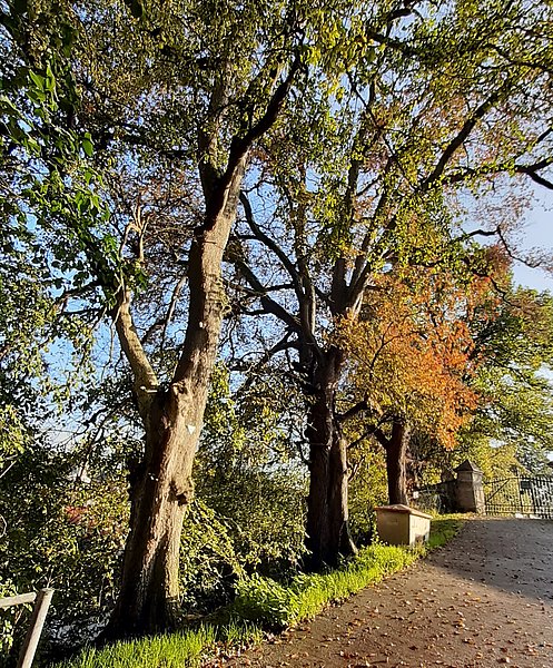 Die Rosskastanien (Aesculus hippocastanum) können bis 300 Jahre alt werden. An ihrem Stamm kann man eine typische Eigenschaft erkennen: ein ausgeprägter Drehwuchs immer nach rechts, was wohl ihrem Stamm mehr Stabilität verleiht. Ganz charakteristisch sind die großen, fingerförmig zusammengesetzten Laubblätter.