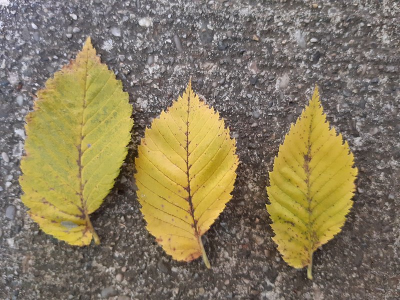 Viele kennen die Bergulme nicht. Dabei gibt es ein typisches Erkennungsmerkmal für alle Ulmenarten, nämlich die asymmetrische Form der Blätter. Deswegen kann man sie auch nicht mit den ähnlichen, aber symmetrischen Blättern der Haselnuss verwechseln. Die Blätter der Bergulme haben einen gesägten Rand, fühlen sich oberseits leicht rau an und bei den größeren Blättern haben sich oft drei Spitzen ausgebildet. Schön ist die kräftig gelbe Herbstfärbung. Die tiefwurzelnde Bergulme kann im Laufe der Jahrzehnte max. bis 40 m groß und bis zu 400 Jahre alt werden.