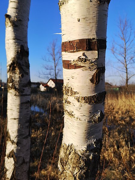 Woher kommt die weiße Farbe der Rinde? Es ist das eingelagerte Betulin, welches das Licht vollständig reflektiert. Vermutlich schützt sich die Birke so vor Rindenschäden durch intensive Sonneneinstrahlung, besonders im Winter. Das Betulin macht die Rinde für Nässe undurchlässig. In nördlichen Ländern gebrauchte man sie daher zum Decken der Häuser. Aus der Rinde kann man den sog. Birkenteer gewinnen, der als gutes Konservierungsmittel für Leder gilt. Die alten Gallier kochten diese pechartige Substanz aus und verwendeten sie als Wagenschmiere und zum Abdichten von Fässern und Booten. Ganz typisch für Birkenholz: es brennt wegen des eingelagerten Birkenteers auch in frischem und feuchtem Zustand gut.
