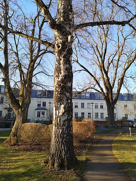 ist auch bekannt unter dem Namen Sand- oder Hängebirke (Betula pendula). Im Kraiburger Ortszentrum wird man im Marktpark fündig, wo einige junge Bäume mit weiß leuchtender Rinde um den Weiher herumstehen und ein paar Meter weiter zwei etwas größere Exemplare neben dem Maibaum-Standplatz. Wenn man die Birke als älteren, ausgewachsenen Baum sehen möchte, kann man in den Garten des Seniorenheims Sankt Nikolaus blicken, wo ein schöner, älterer Baumbestand aus unterschiedlichen Baumarten wächst, darunter auch drei große Birken. Bei diesen Bäumen erscheint die Rinde viel weniger weiß, denn sie ist tief gefurcht und mit schwarzen Längsrissen durchzogen.