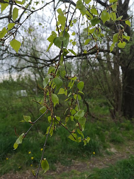 Als erster unserer heimischen Laubbäume treibt die Birke aus und gilt mit den zarten, frischgrünen Blättern als Frühlingssymbol. Sie blüht in tieferen Lagen bereits im April: die männlichen Kätzchen hängen an den Enden älterer Zweige, die weiblichen Kätzchen bilden sich der an der Spitze junger Zweige. Die Blüten werden vom Wind bestäubt. Die häutig geflügelten Nussfrüchte werden ab August ebenfalls vom Wind verbreitet.