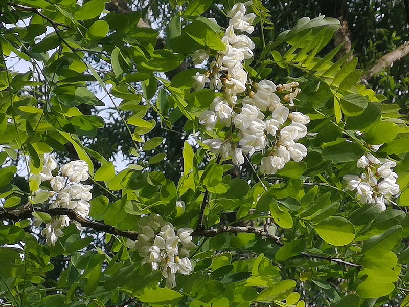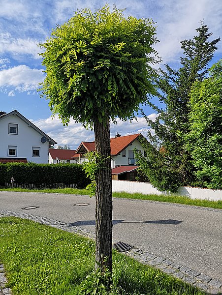 Viele kennen die Robinie (bot. Robinia pseudoacacia) aus der Familie der Schmetterlingsblütler gar nicht. Einen großen, über  100 Jahre alten Robinien-Baum kann man im Apothekergarten im Schießstättenweg entdecken. Ganz anders dagegen schauen die kleinen Robinien in geschnittener Kugelform als Straßenbäume in der Max-Schwaiger-Straße aus.