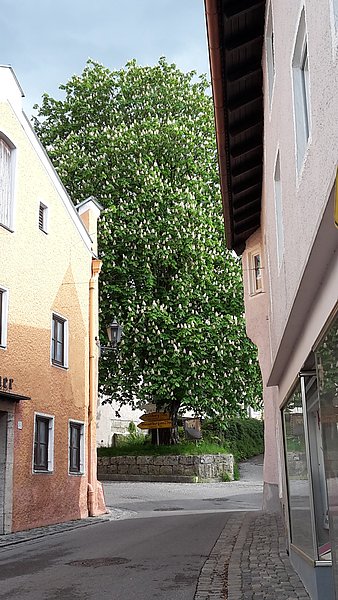 Immer wieder im Frühjahr ist es soweit: die Kastanienbäume erfreuen uns im Mai mit ihren großen, weißen Blütenkerzen. Beim Kraiburger Baumrundgang machen wir selbstverständlich der markanten Kastanie im Ortskern Kraiburgs unsere Aufwartung. Steht sie doch direkt in der Ortsmitte, als einziger Baum der Langgasse, im unteren Teil der Straße. Glücklicherweise hat sie eine kleine Grünfläche um sich herum, so dass sie ihr flaches und starkes Wurzelwerk gut ausbreiten konnte und genügend Niederschlagswasser über den Wiesenboden abgreifen kann.