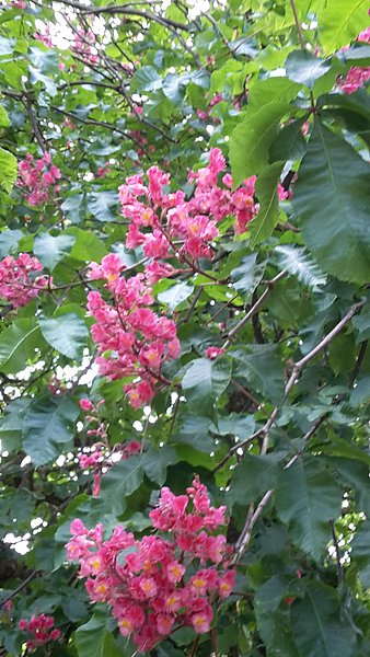 Auf dem Kraiburger Baumrundgang kommt man auch an einer weiteren, wunderschön gewachsenen Kastanie vorbei: eine rotblühende Kastanie am Schießstättenweg, schräg gegenüber der Robinie des Apothekergartens (Baum Nr. 8 des Baumrundgangs). Sie ist eine Kreuzung aus der gewöhnlichen Rosskastanie und ihrer nordamerikanischen Schwester. Interessanterweise wird die rote Rosskastanie von der Miniermotte nicht befallen.