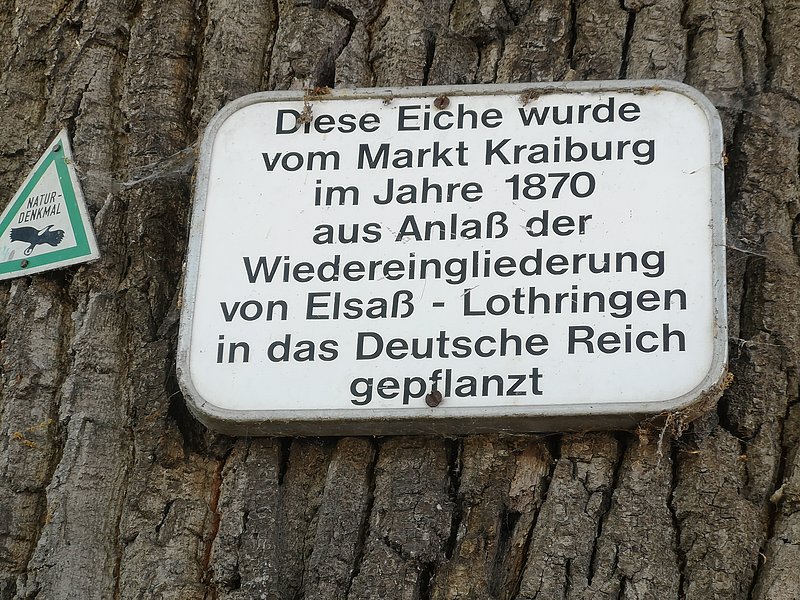 Im Oktober 2020 feierte die Ortsgruppe vom Bund Naturschutz Kraiburg ein besonderes Geburtstagskind: die große Eiche an der Guttenburgerstraße, schräg gegenüber vom Getränkemarkt, die in diesem Jahr ihren 150. Pflanzgeburtstag hatte. Viele Menschen werden schon x-mal mit dem Auto vorbeigefahren sein, ohne sie groß bemerkt zu haben, da sie sehr randlich steht. Ihre starken Äste ragen allerdings weit über die Fahrbahn. Zwei Schilder sind an ihrem Stamm befestigt: das Schild, das über die Ausweisung als geschütztes Naturdenkmal informiert und das Schild mit der Aufschrift, dass sie aus Anlass der Wiedereingliederung Lothringens ins Deutsche Reich 1870 gepflanzt wurde. Es ist schön, bei einem Baum das genaue Pflanzdatum zu wissen, denn so muss man beim Alter nicht rätseln.