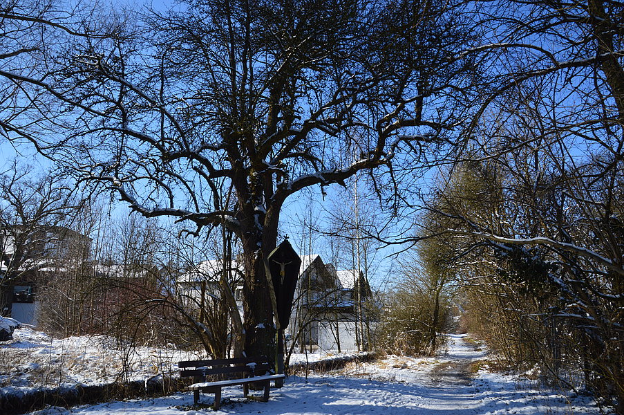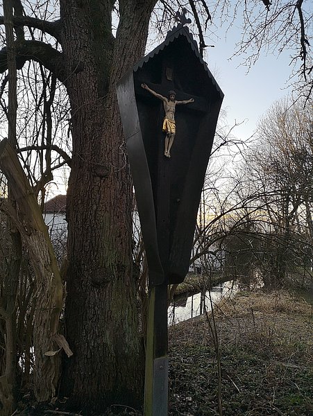 Beim Kraiburger Baumrundgang kommt man an einer besonders schönen Stelle vorbei: am Bruckmühlweg hinter dem Getränkemarkt, da wo der Bruckmühlbach aus dem Wanklbach ausgeleitet wird, stehen ein älterer Birnbaum, unter ihm ein Holzkreuz mit dem gekreuzigten Christus und eine Bank, die an diesem schattigen, wild-romantischen Standort zum Verweilen einlädt. Das Wasser der beiden Bäche plätschert leise vor sich hin und man staunt über die Ruhe und Beschaulichkeit mitten im Ortskern von Kraiburg.