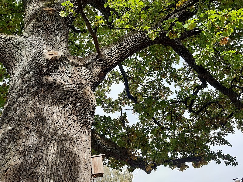 Wenn man bedenkt, dass die Eichen 500 bis maximal 1000 Jahre alt werden können, befindet sich unser Baum gerade mal im „jungen Erwachsenenalter“. Bäume haben es so gesehen nicht eilig. Ab 60 Jahren bildet die Eiche die ersten keimbaren Eicheln, die übrigens lang gestielt sind, daher kommt der Name Stieleiche (botanisch Quercus robur).